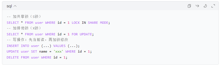 核心逻辑:写操作(UPDATE/DELETE/INSERT)执行时,会先对目标行执行当前读,加排他锁,再执行修改,这也是为什么写写冲突必须靠锁解决的原因。