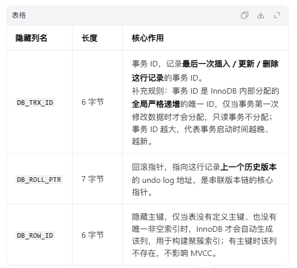 InnoDB 的聚簇索引中,每一行记录除了我们自定义的业务列,还会自动生成 3 个隐藏列,是 MVCC 和事务管理的基石: