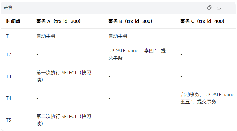 此时最终版本链:最新版本(王五,trx_id=300) → 历史版本1(李四,trx_id=200) → 历史版本2(张三,trx_id=100) → NULL