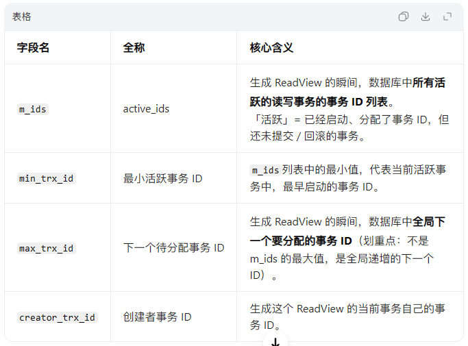 1. ReadView 的核心结构(4 个关键字段,缺一不可)