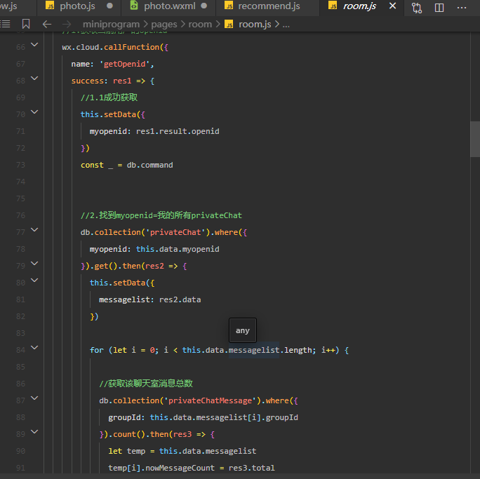 (发起聊天的过程:AB用户互为陌生人时,当A用户点击与B的聊天,会调用云函数getPrivateChatGroupId得到一个groupId,同时会把A作为myopenid,B作为youropenid和组id写入数据库。建立双方聊天关系:用户B点击的这个新聊天,会自动往数据库中,写入B作为myopenid、相同groupid的数据)