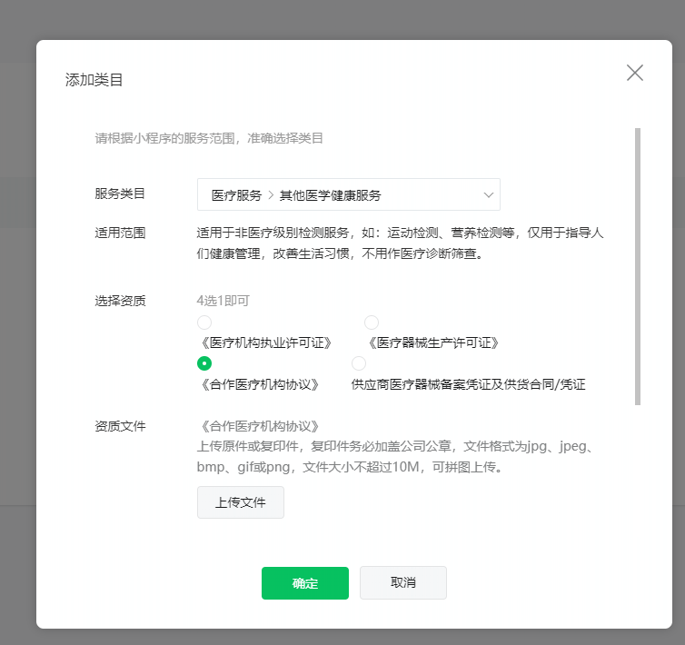 请问谁有,微信小程序选择类目时,医疗服务的,《合作医疗机构协议》,模板,谢谢!
