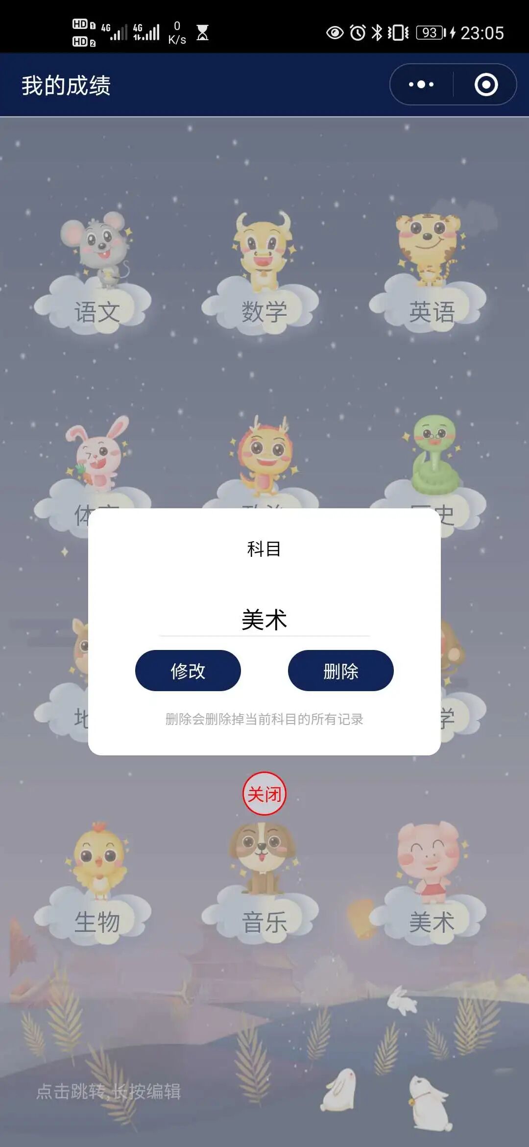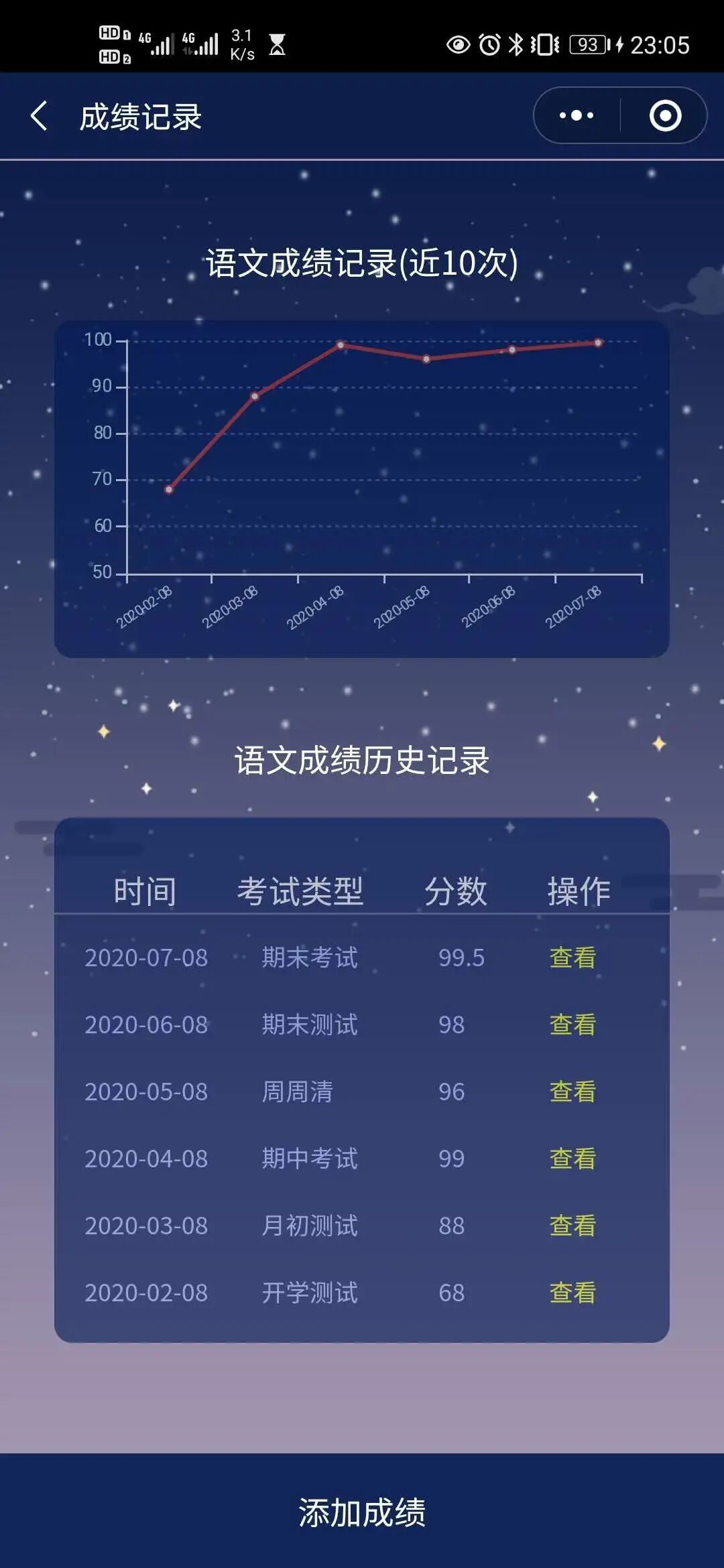 提供科目分类,最多提供12个科目。每个科目提供最近10次的统计图表和历史成绩记录。科目和成绩都可以修改和删除。