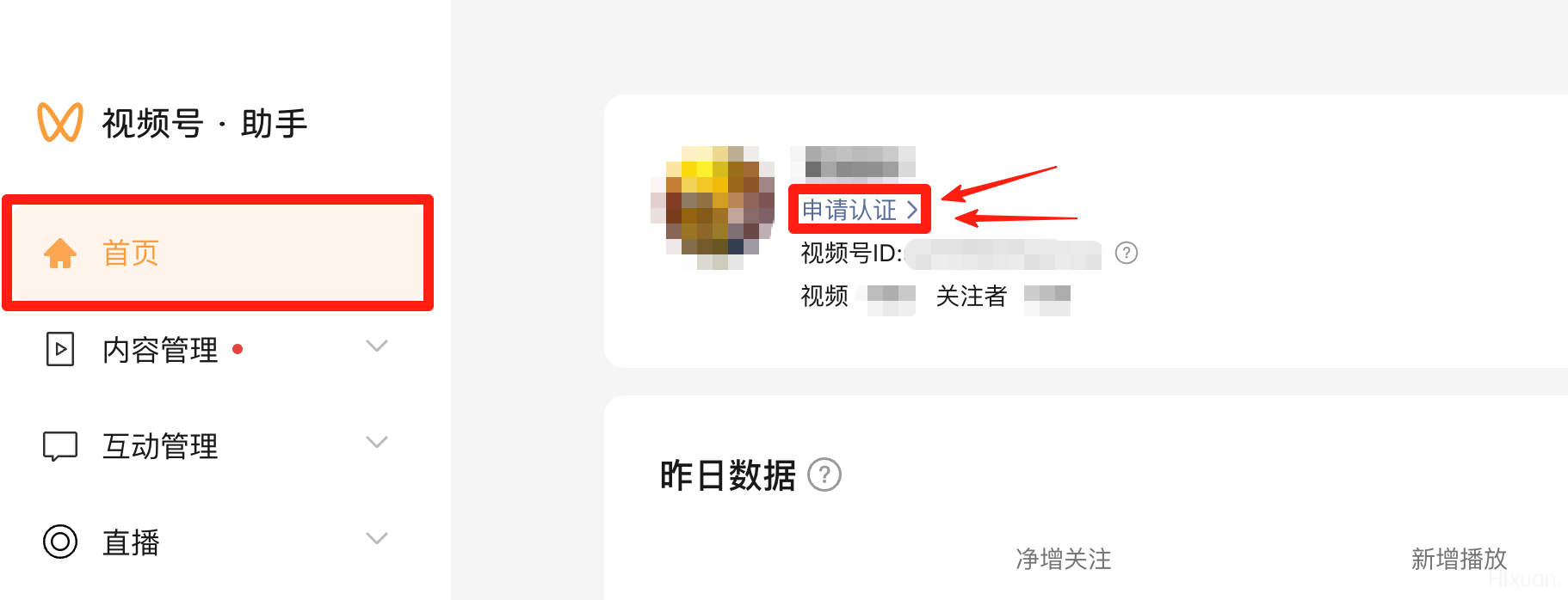 目前视频号助手认证申请入口在首页——视频号名称下方。