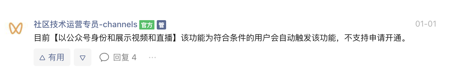 你好,目前「以公众号身份和展示视频和直播」该功能为符合条件的用户会自动触发该功能。 这个规则是1月2号开始取消了吗?一律没有了?