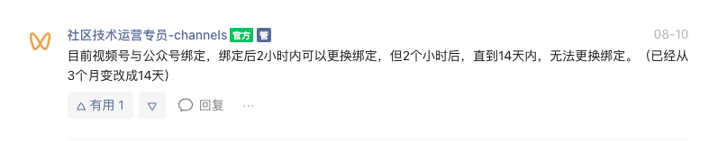 目前视频号与公众号绑定,绑定后2小时内可以更换绑定,但2个小时后,直到14天内,无法更换绑定。