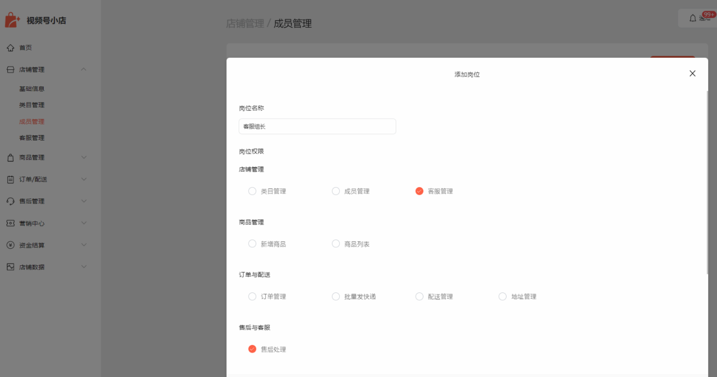 - 企业店支持多人管理。在“店铺管理-成员管理”中,添加岗位和关联成员即可,可以添加不同岗位,设置岗位权限。