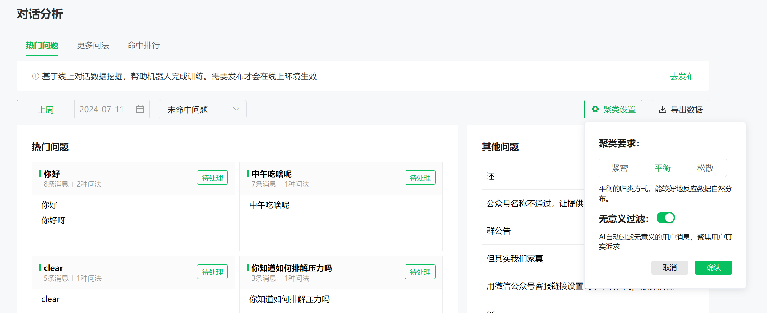 增加了聚类设置功能。可以由 AI 过滤无意义的问题,并支持调整聚类要求。 这样可以更具机器人的实际情况更高效准确的洞察到用户需求。