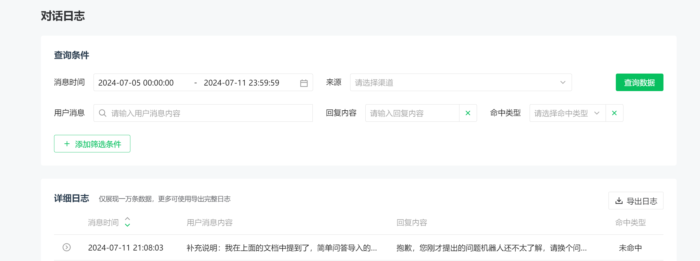 可以看到 7 天内完整的机器人对话详细日志的筛选和导出。满足个性化的复杂数据分析需求。