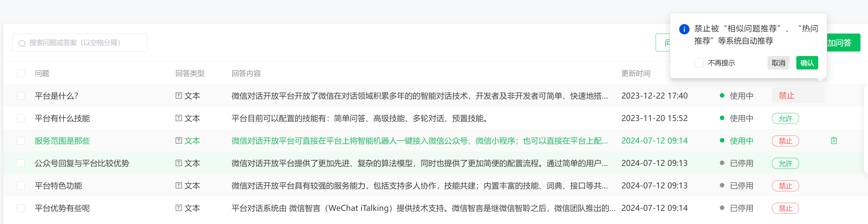 新增批量操作和独立的问题推荐开关,关闭后可让问题仅被精准命中,无法被问题推荐。比如一些寒暄类的特定回复不希望被相似问题推荐,就可以通过此功能实现屏蔽。