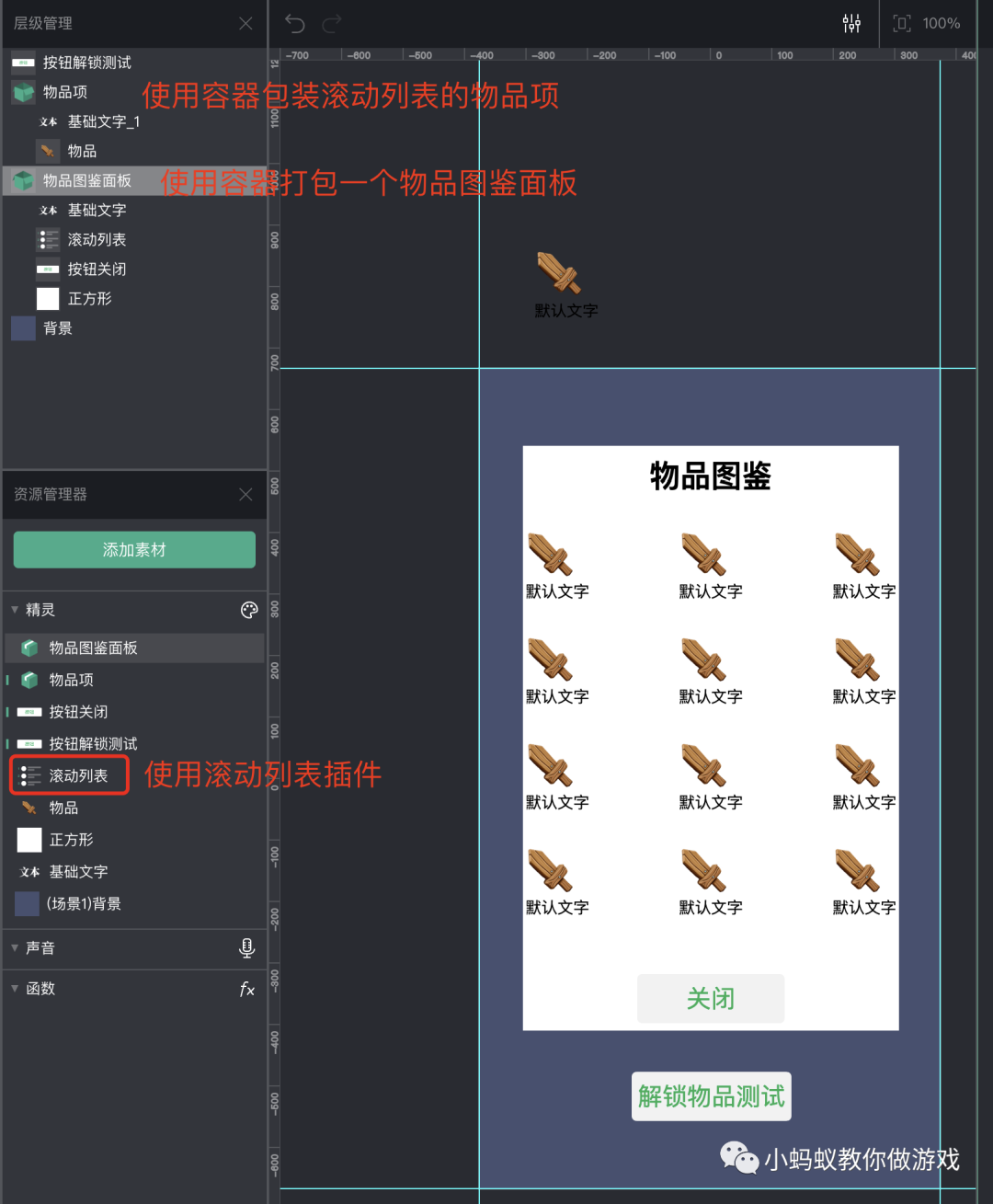 如图,我们导入了滚动列表插件(位于素材库中的插件类别中),制作了两个容器,一个是显示物品图鉴的面板,一个是用于滚动列表中的物品项。