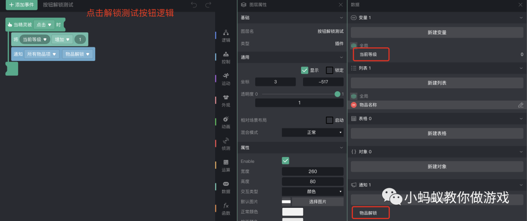 为了测试,我们增加了一个按钮,创建了一个“当前等级”的全局变量,以及一个“物品解锁”的通知。