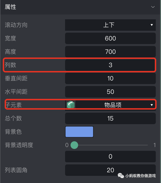 有的同学问我做的滚动列表为什么只有一行或者一列呀?那是因为你没有设置行数或者列数呀!这里滚动方向选择的是“上下”,下面对应的会出现列数的属性。如果滚动方向选择的是“左右”,那下面对应的会出现行数的属性。