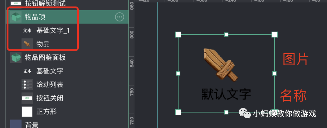 在子元素中选择我们制作好的“物品项”容器,子元素中可以选择单个精灵或者容器。
