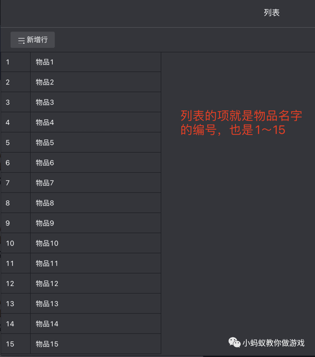 如图,因为物品只需要一个名字,所以我创建了一个列表,如果你的物品还需要介绍等其它信息,可以选择使用一个表格来管理数据(表格的行号就是编号),列表中的第几项代表的就是这个物品名字的编号。