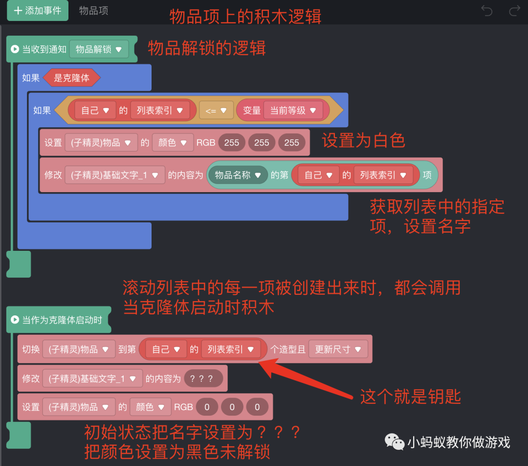 这里有两个重点:第一是所有滚动列表中的项,都是被滚动列表插件克隆出来的,所以初始化操作应该放在“当克隆体启动时”积木中,如果你把初始化操作放在“当场景启动时”积木中,就会发现初始化操作没有完成。第二是列表中的项是从 1 开始计数,想要知道当前是第几项,可以通过使用积木“自己的列表索引”来获得,这个列表索引就是我们之前所说的那把钥匙。