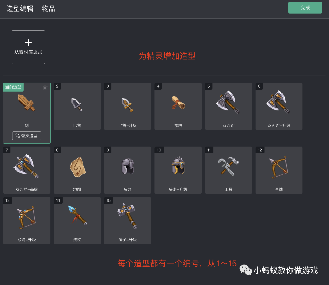 我们可以为一个精灵图片增加很多个造型(你可以把造型理解为一个人的很多套衣服),每个造型都有一个独立的编号,这个编号就是切换造型的关键。