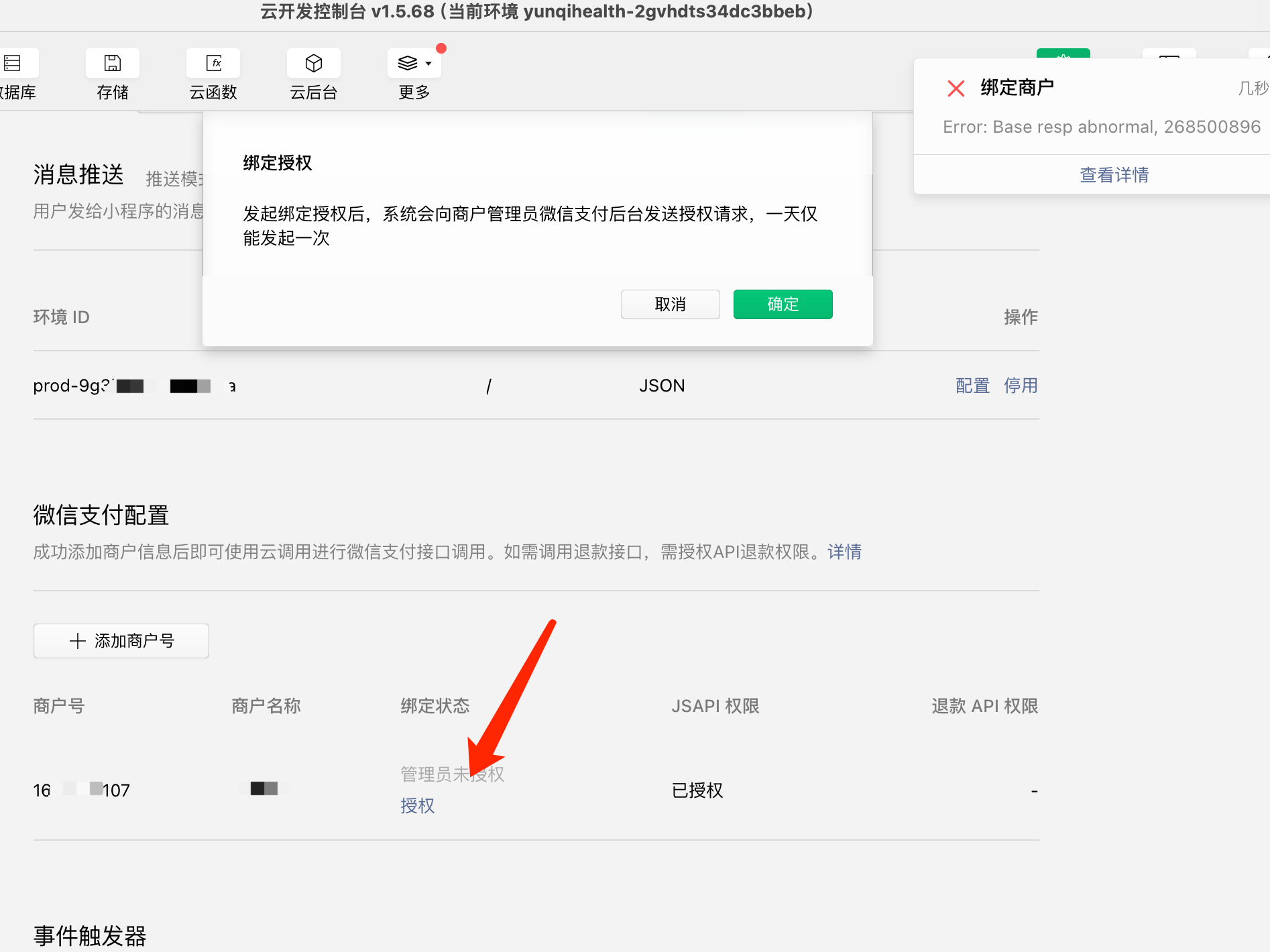 微信云开发,商户点击授权提示Error: Base resp abnormal, 268500896 appid :wxd0597ae7f5aab576微信云开发,商户点击授权提示Error: Base resp abnormal, 268500896 appid :wxd0597ae7f5aab57的丹丹丹@丹微信云开发,商户点击授权提示Error: Base resp abnormal, 268500896