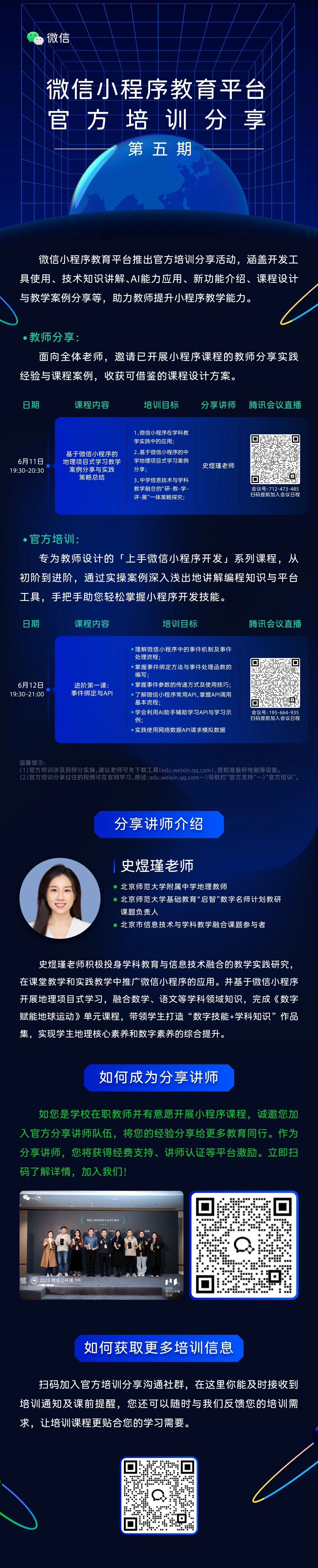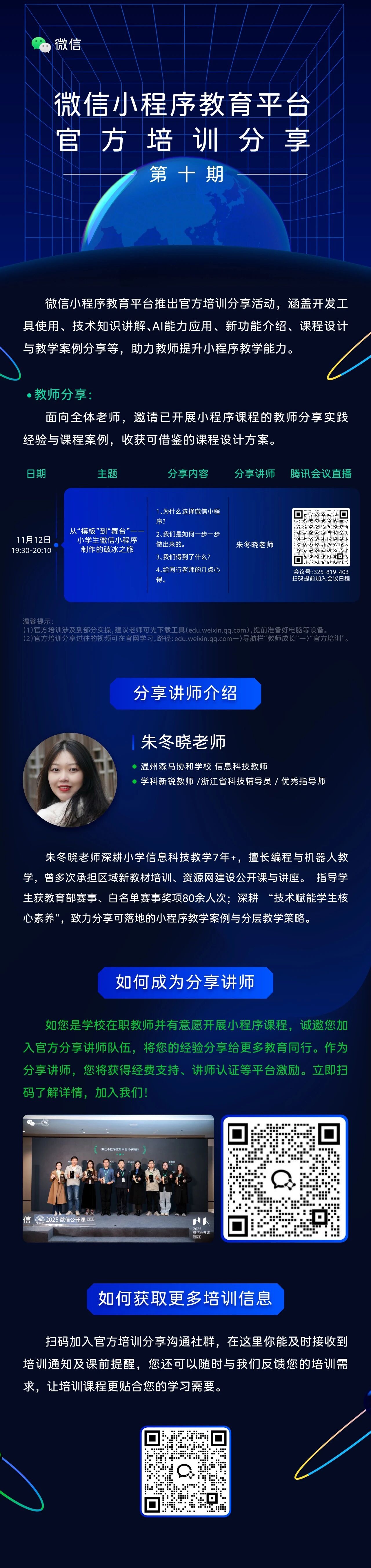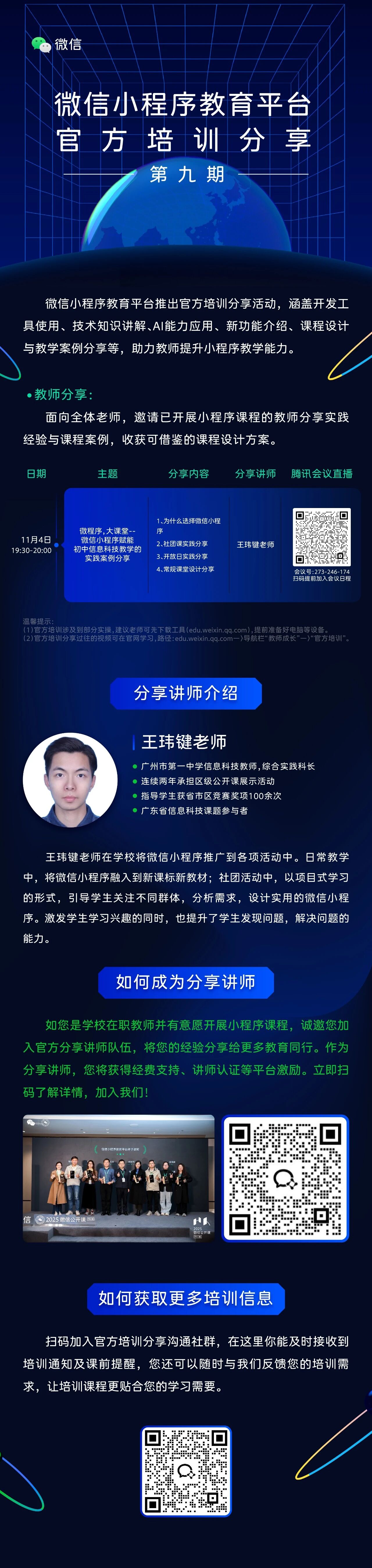 第九期教师分享「微信小程序赋能初中信息科技教学的实践案例分享」,具体课程内容可看下方海报,若想获取以往培训回放,欢迎移步文章评论区~