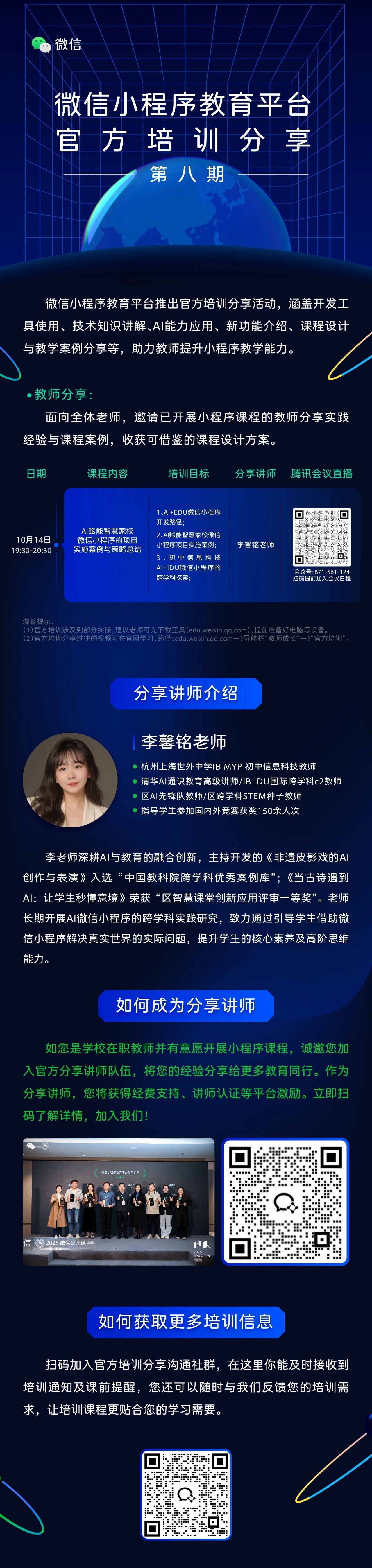 第八期教师分享「AI赋能智慧家校微信小程序的项目实施案例与策略总结」,具体课程内容可看下方海报,若想获取以往培训回放,欢迎移步文章评论区~