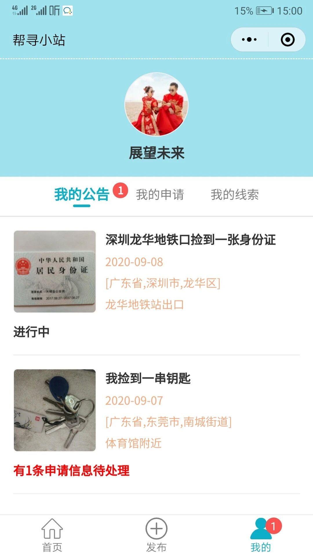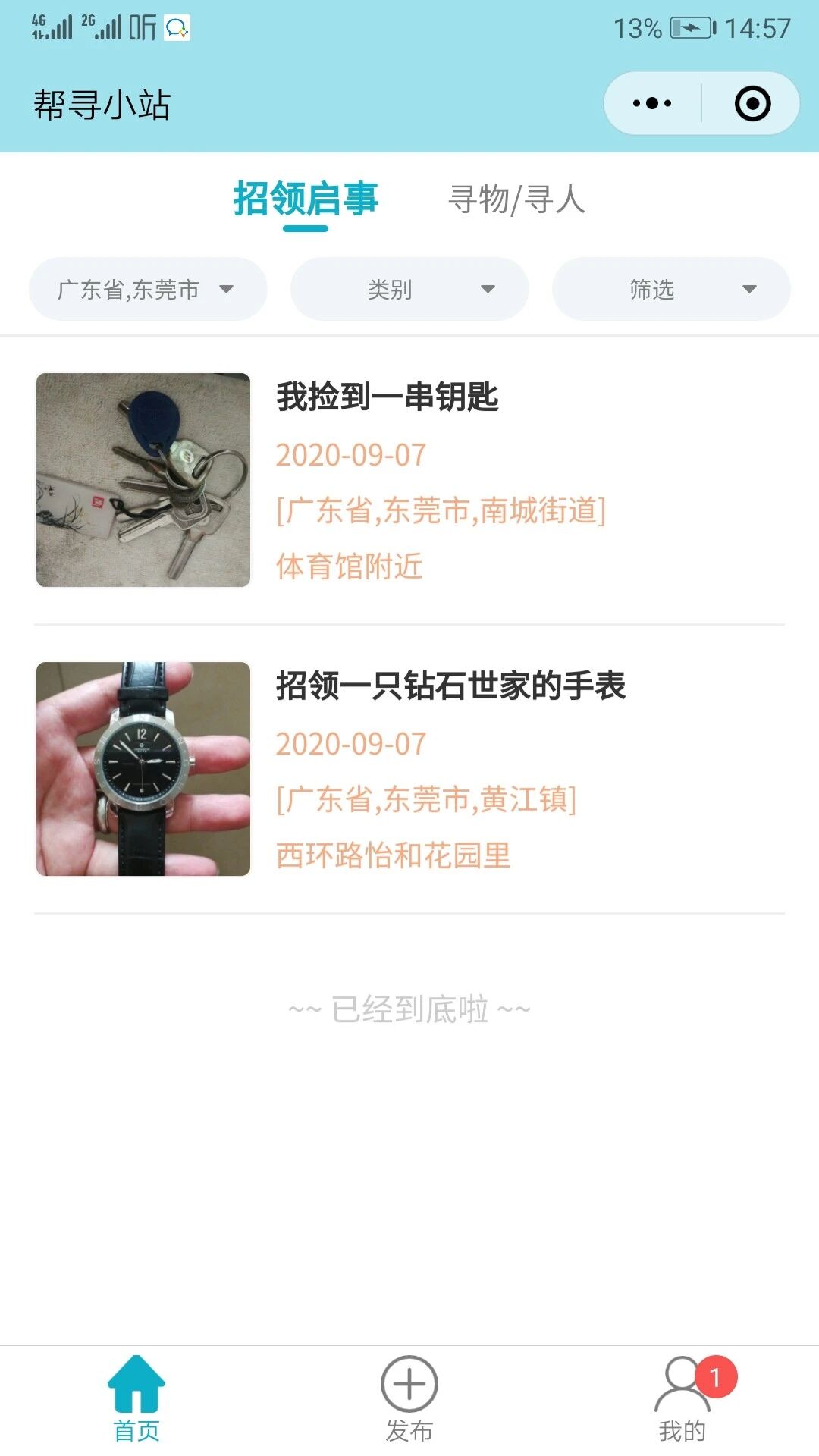 帮寻小站小程序旨在方便用户发布寻物启事、寻人启事和招领启事等公告,依托于微信的强社交性实现公告的快速传播,让失主和好心人之间的沟通更加安全和高效。