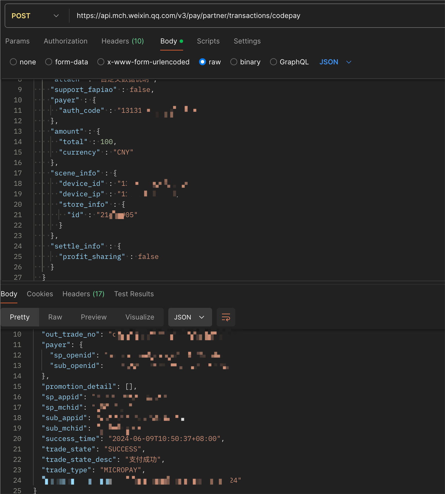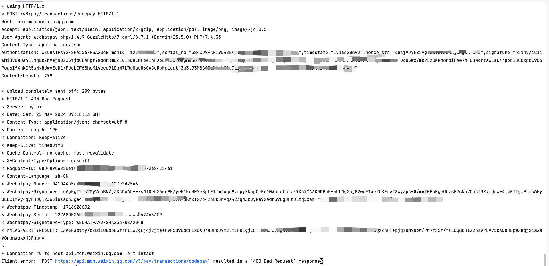 `POST https://api.mch.weixin.qq.com/v3/pay/transactions/codepay` resulted in a `400 Bad Request` response%