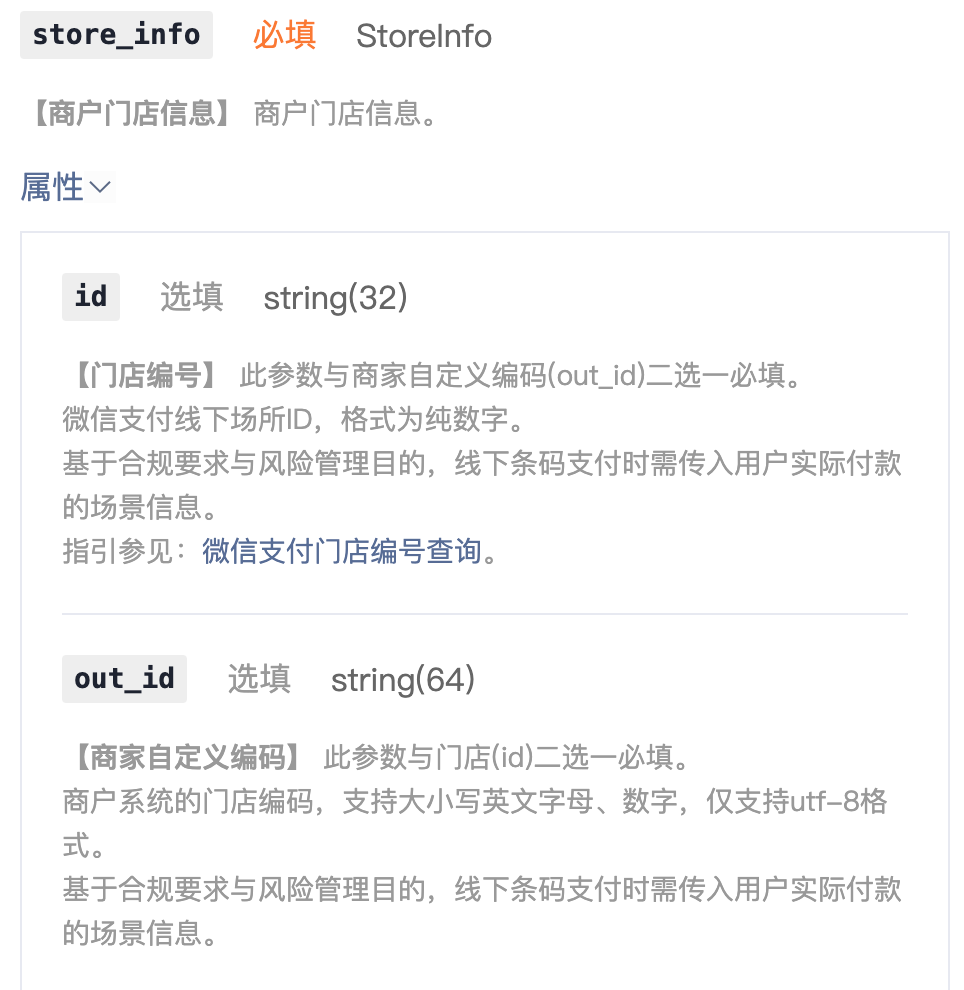 1、是store_info里面,其他接口id商户侧的门店编号,而付款码支付id是微信侧的门店比那好,多了一个out_id是商户侧的门店编号,为此需要重新定义个struct,不知道还能不能统一