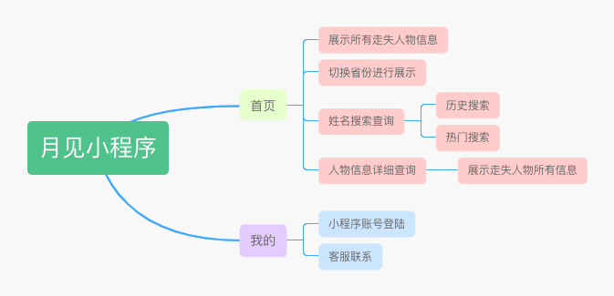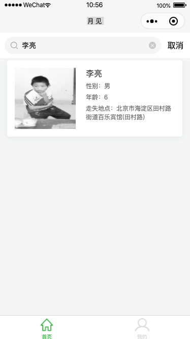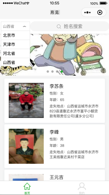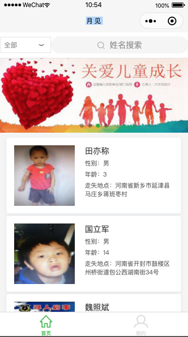月见是通过展示走失人物信息的微信小程序,主要通过不同省份展示信息、姓名搜索查询的方式展示走失人物信息。由于时间有限,这只是一个最简单的Demo,后续也会进行优化。
