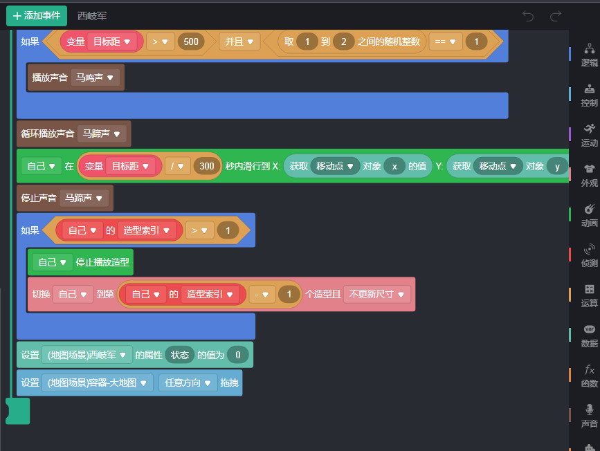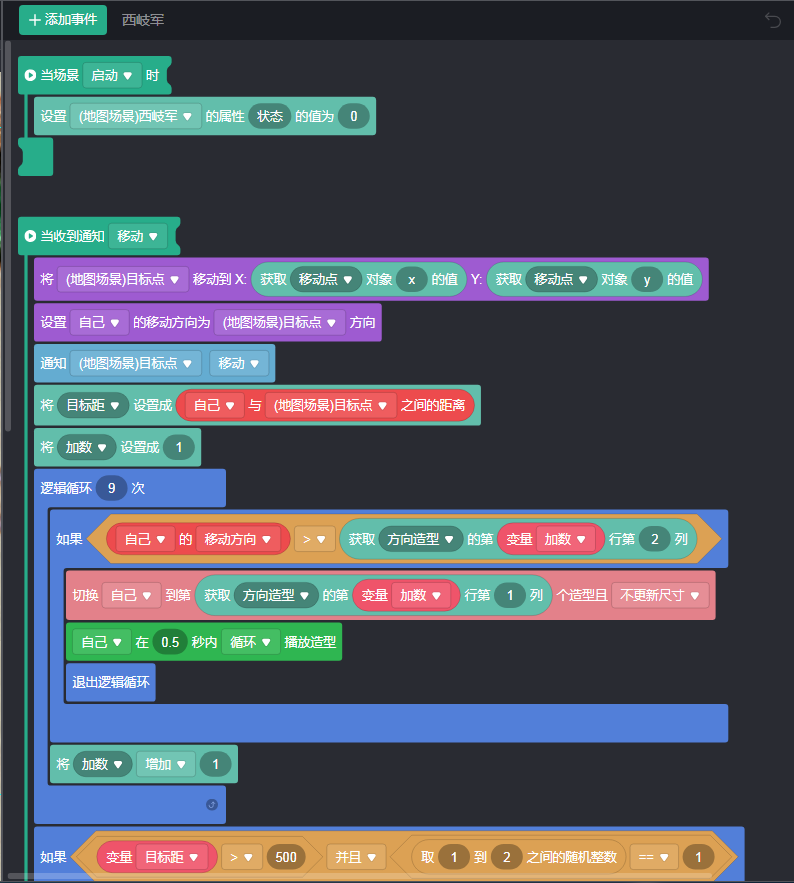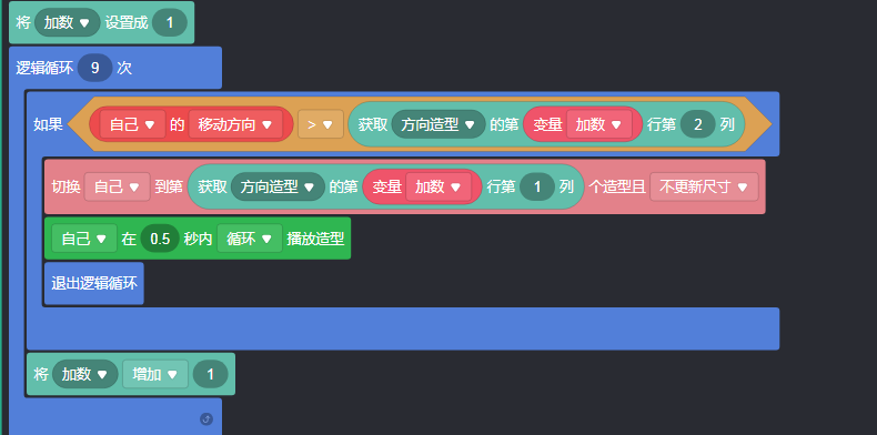 关于军队造型随方向变更的逻辑,这里采用的是遍历预设表格模式,比起完全用“如果...否则...”嵌套的方式,这样做可以大幅减少积木块的数量,是笔者用来精简代码量的不二“法宝”!想想看,把九个“如果”嵌套起来会占多大的篇幅......