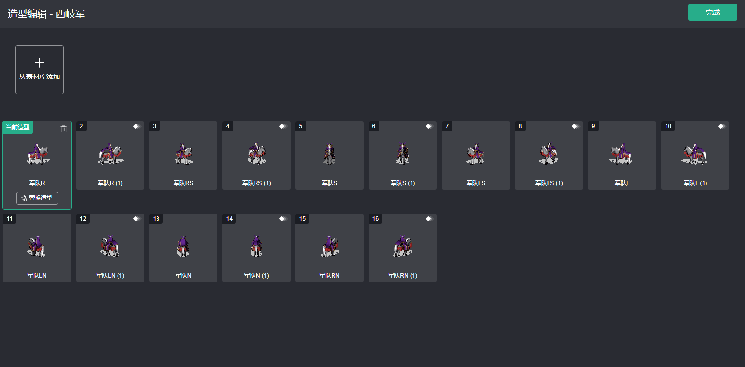 接下来看看部队的造型布局,这里用了16种造型分别代表8个方向的静态与动态效果