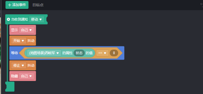 其代码如下,启动时设置自身状态为0(部队当前停止),通知事件【移动】的具体解释为: