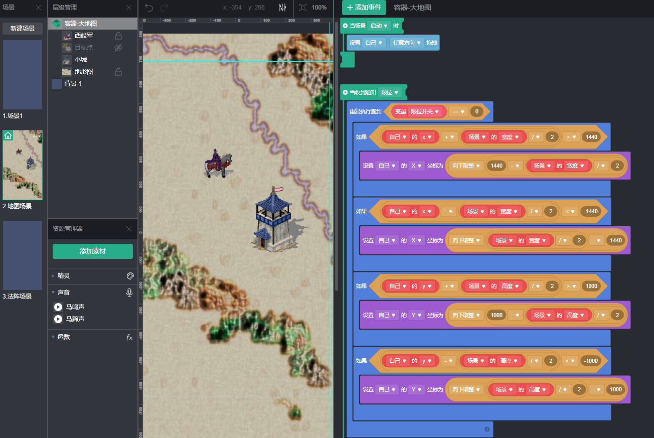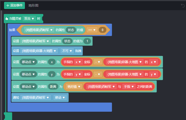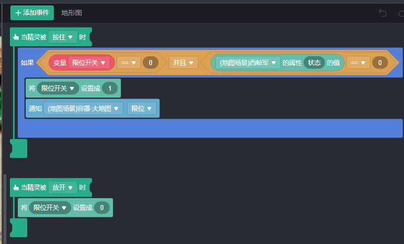 下面对其中元素分别介绍,首先看下【容器-大地图】(该容器包含场景内所有精灵),它的事件代码主要是接收通知【限位】,容器与其中的地形图尺寸等同,拖动时可以将地图场景边缘限制在终端屏幕尺寸内。