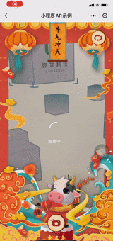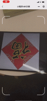 此示例展示了AR扫福的实现,扫描福字(百度搜索福字图片扫描)播放序列帧(非精灵图序列,而是一些连续的序列图片),序列帧播放完毕后,跳转到新的小程序页面,开发者可以在新的页面开发比如发券、发红包等功能