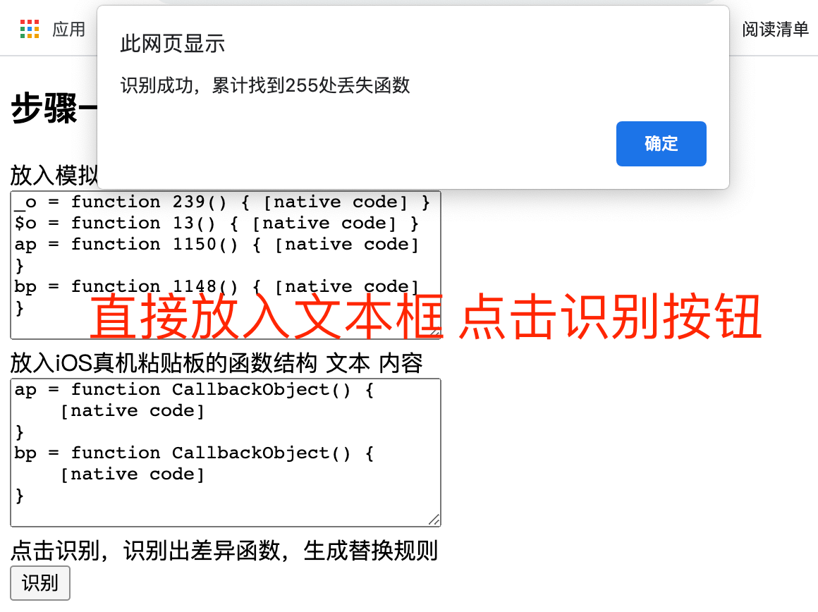 - 分别在模拟器与iOS真机中运行该脚本,获得粘贴板内的文本内容。可以看到模拟器中有855个导出函数,而iOS真机只有600个导出函数。接下来我们需要借助脚本进行批量扫描,得到需要替换的序列。使用浏览器打开本仓库 /tool/index.html 替换工具,将模拟器给出的粘贴板内容复制到第一个文本框内,将真机给出的粘贴板内容复制到第二个文本框内,点击识别。如下图所示。