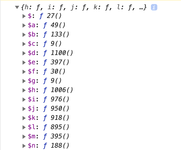 其中 $、$a…就是导出函数名,后面的 f 27() 、f 49() 是导出的函数指向的实际指针,报错的原因就是同一个实际指针被导出多个函数名(意味着右边存在超过3个以上相同的实际指针),多出的导出名在iOS中被忽略掉,因此导致了报错。
