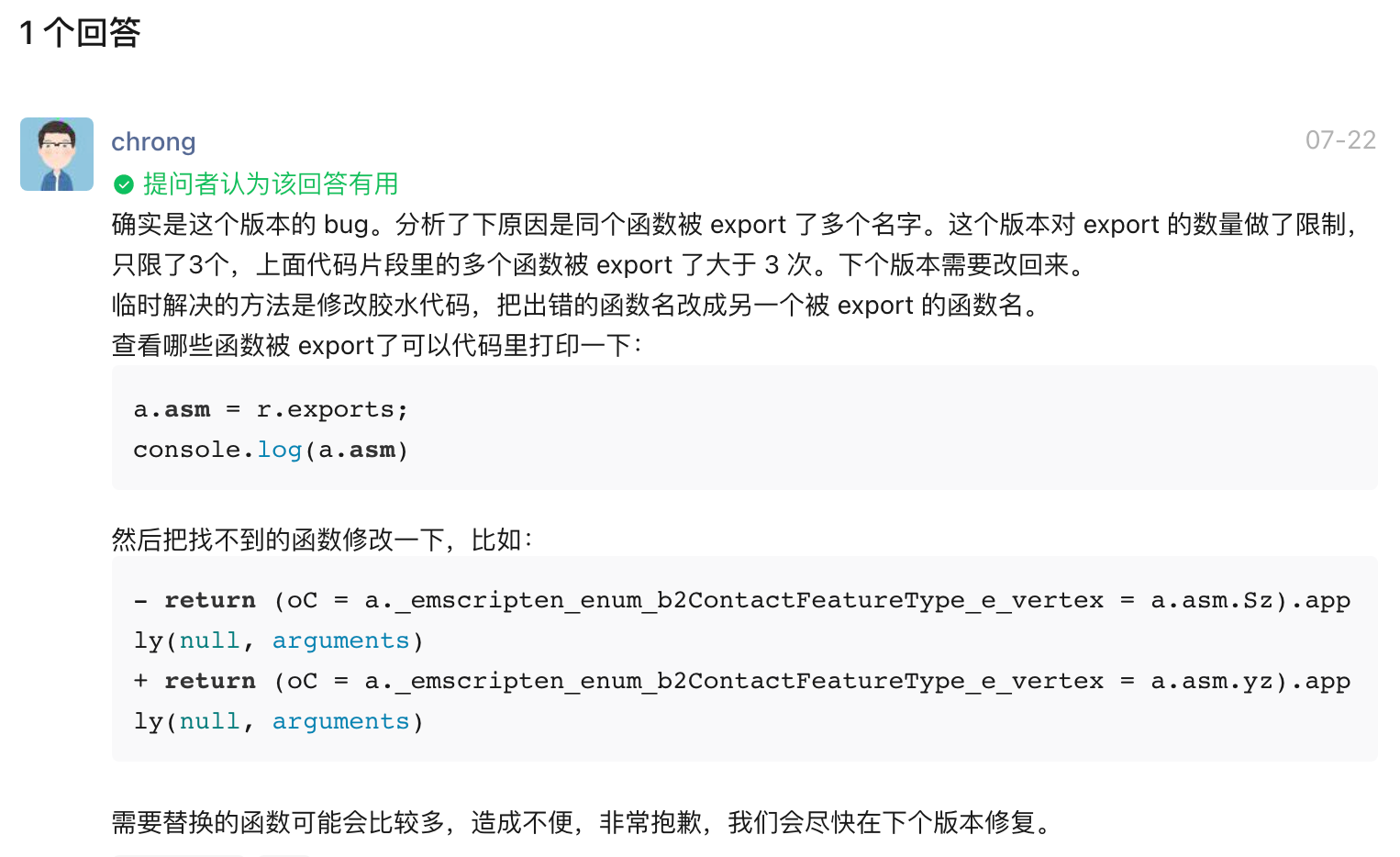 根据官方的说明是指JS胶水层代码在对同一个函数的导出做了次数限制,超过3次函数将没有实际的指针,官方将在后续的客户端版本修复这一问题,但修复前需要进行手动适配,经过本人的实际操作,已成功修复,因此本文将总结出这一问题的修复指引。