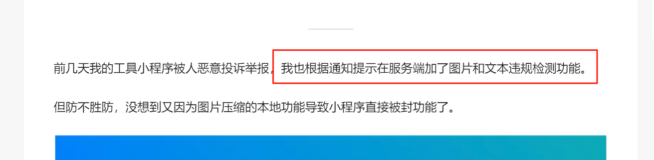 前几天我的工具小程序被人恶意投诉举报,我也根据通知提示在服务端加了图片和文本违规检测功能。