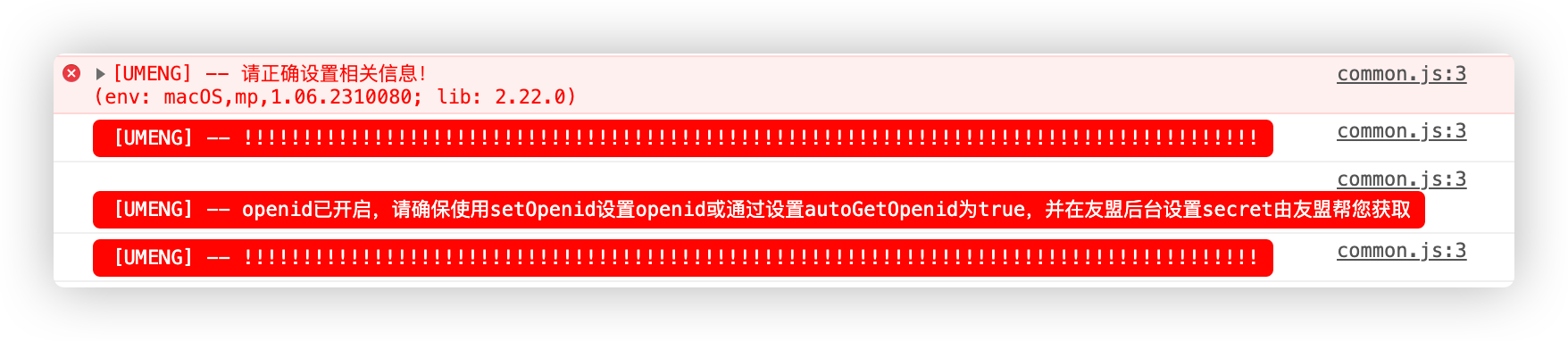 方法二:开启autoGetOpenid: true并在友盟后台设置有效appId及secret信息。友盟后台配置地址:https://mp.umeng.com/setting/appset
