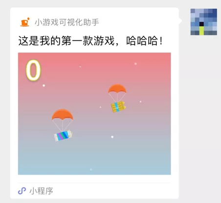 而且在用户分享和发布的时候,还可以自定义微信分享小游戏时的卡片文案,比如可以设置为:“这是我的第一款游戏,哈哈哈!”,效果如下: