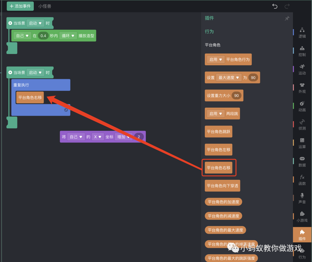 接着,我们做一点儿修改,使用平台角色行为提供的“平台角色右移”积木,替换原来的设置X坐标增加的积木。