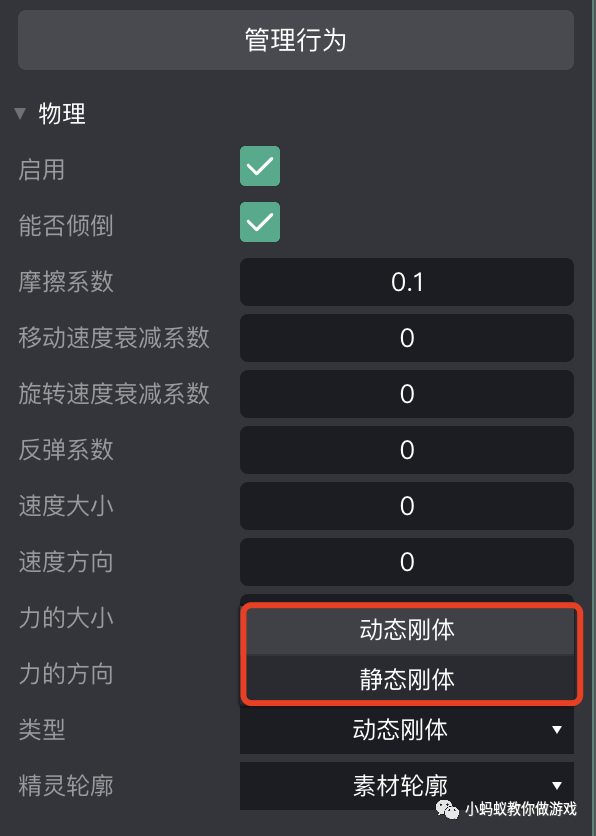 如图,物理行为中倒数第二个属性是“类型”,其中包含两个属性,动态刚体和静态刚体。动态刚体用于游戏中的会动的精灵,比如说移动的人物角色,静态刚体用于游戏中的静态的精灵,比如说静止的地面或者墙壁。