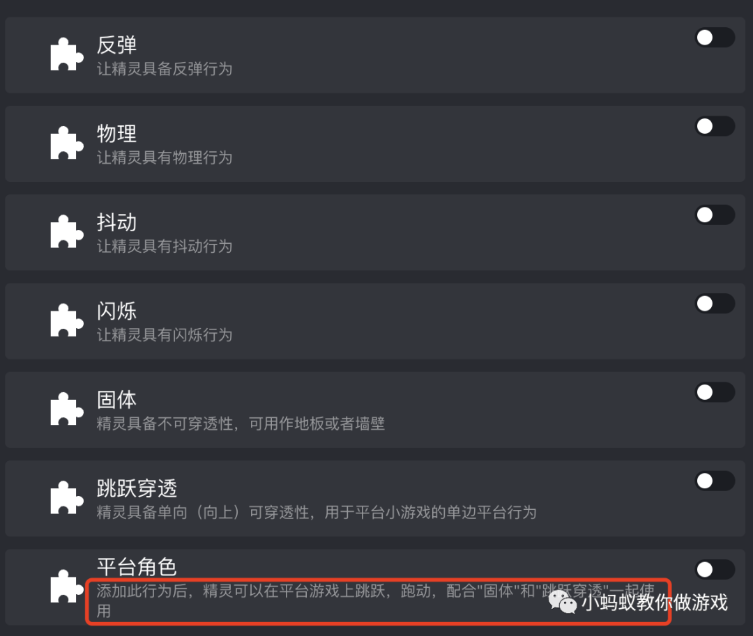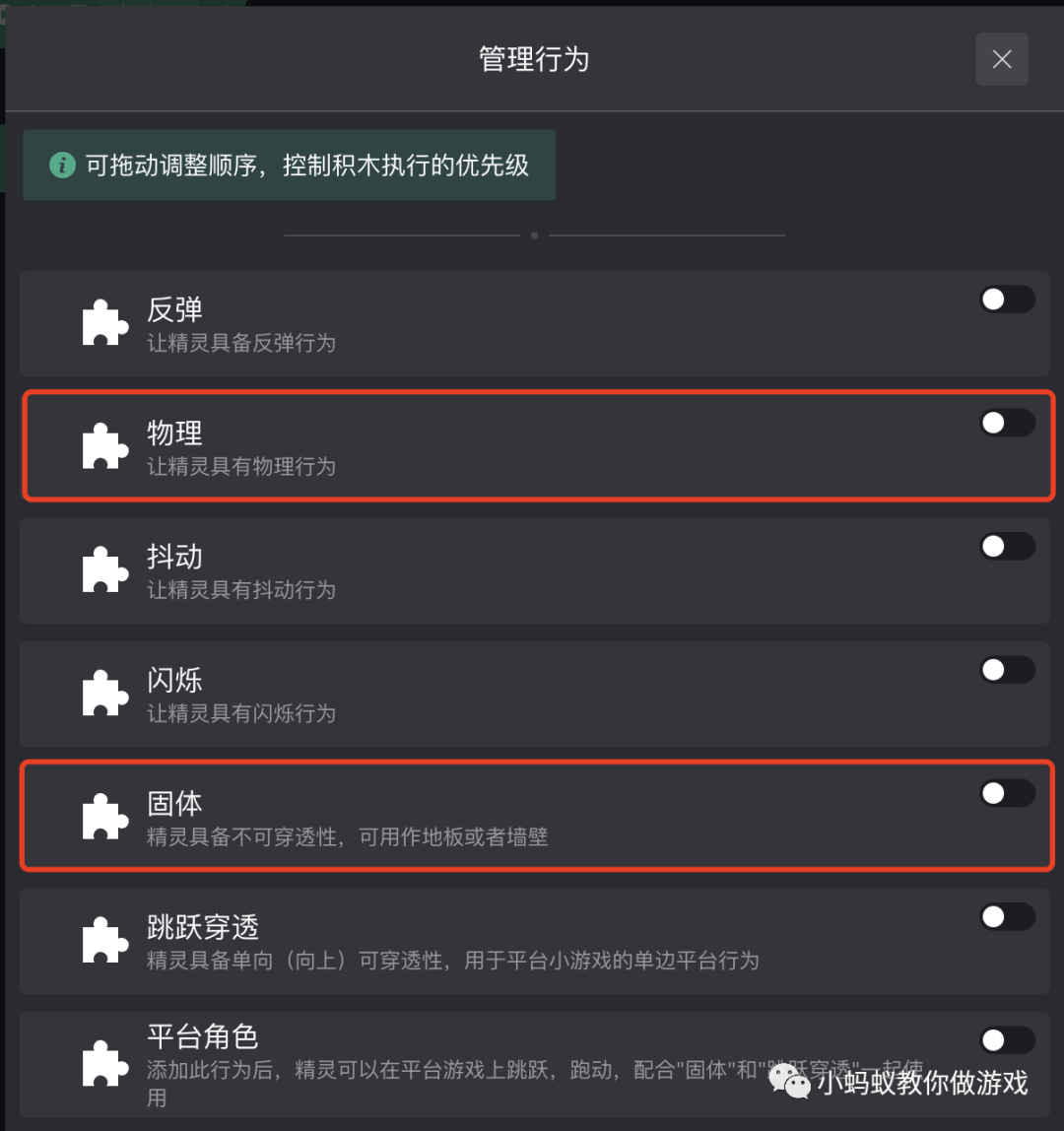 请再仔细阅读一遍:添加此行为后,精灵可以在平台游戏上跳跃,跑动,配合“固体”和“跳跃穿透”一起使用。看到了不?固体行为是配合平台角色行为一块儿使用的,它不是跟物理行为一块儿使用的。