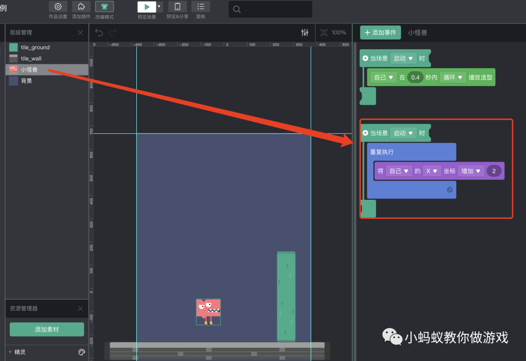 我们给小怪兽增加一段向右移动的积木逻辑。