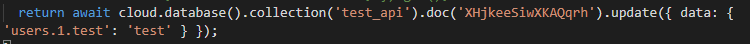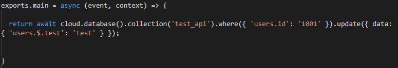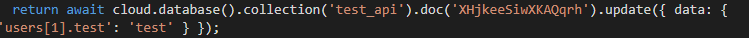 在云函数中执行1中的代码,数组users中id为1001的用户添加了一个新的属性test