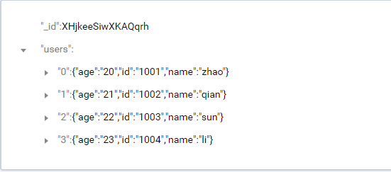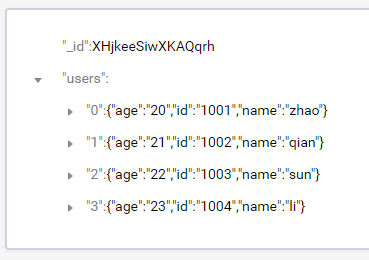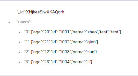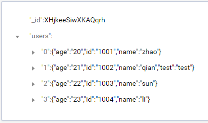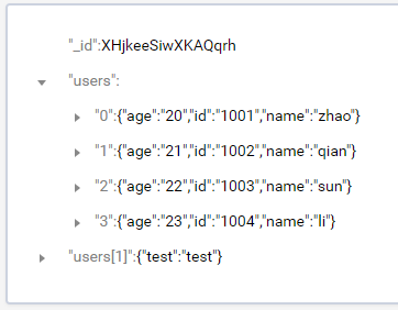 相对于第一种方法,这种方法更加简单,只不过users.1.test这种写法有点颠覆js和java中的属性书写规则,让人感觉怪怪的,在mongoDB中,也支持点数字这种写法。