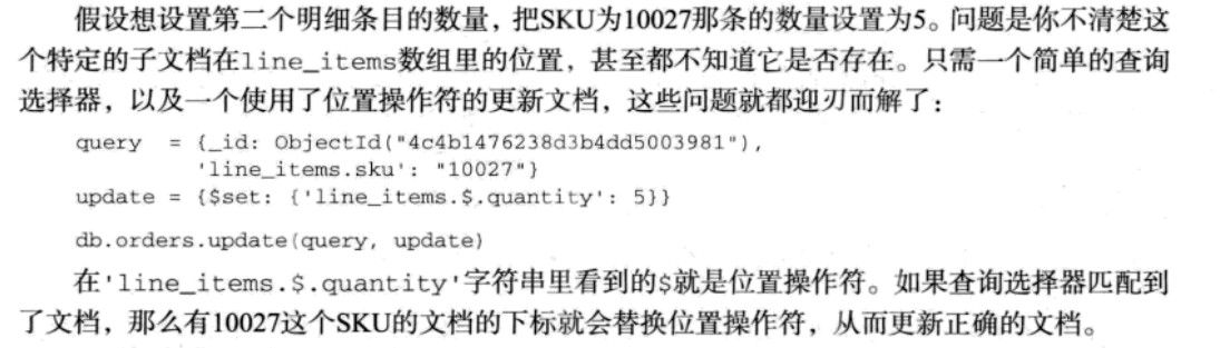 注意里面的$符号,在mongoDB中,这个符号叫做位置操作符,代表数组的下标,如下引自《mongoDB实战》