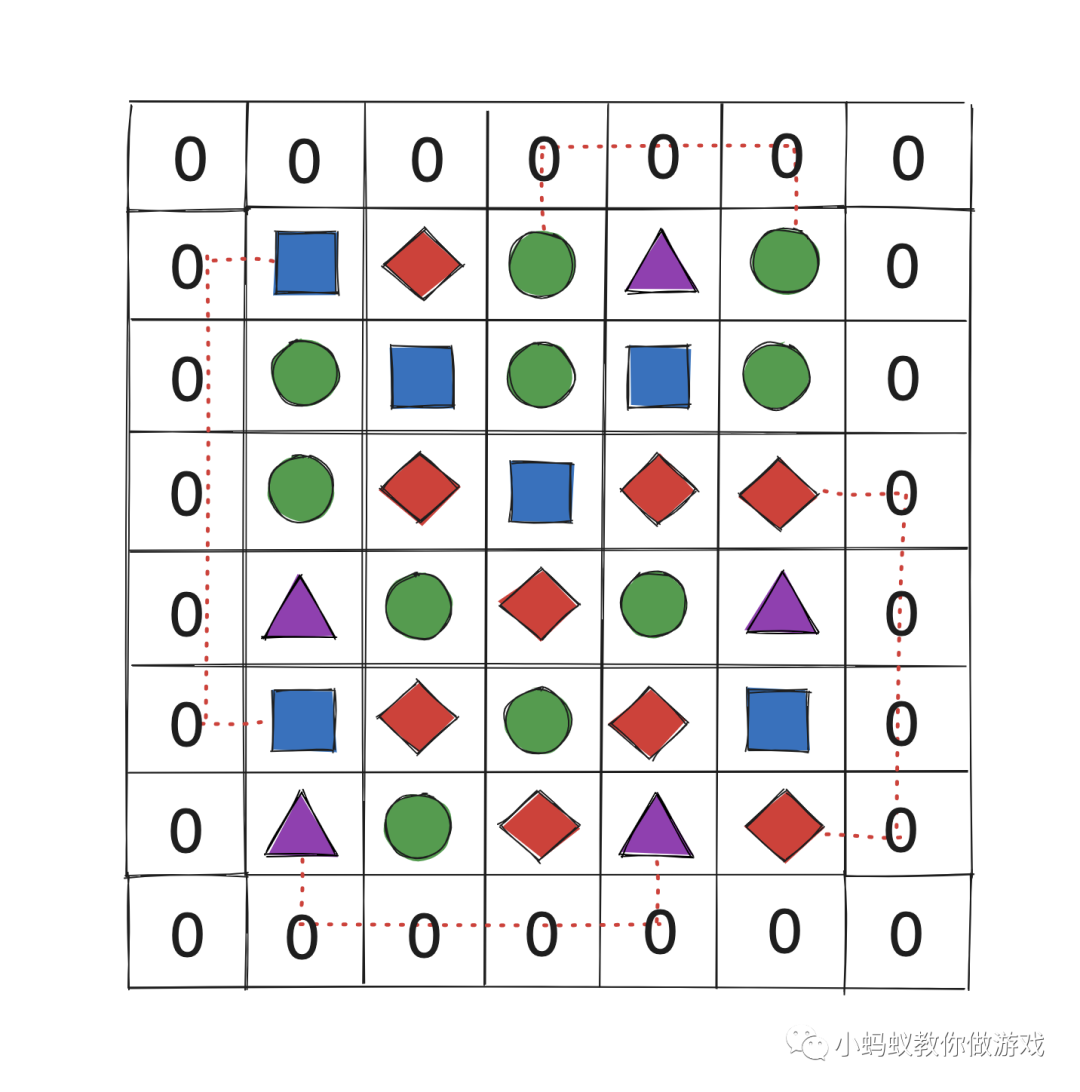 如图,我们在整个表格的上下左右四个方向上各增加了一行/列,这些增加的位置都是空的(用 0 表示),这样对于边界上的两个图标能否连接,就可以通过判断边界再往外一行或列的位置上是否都为 0 即可。