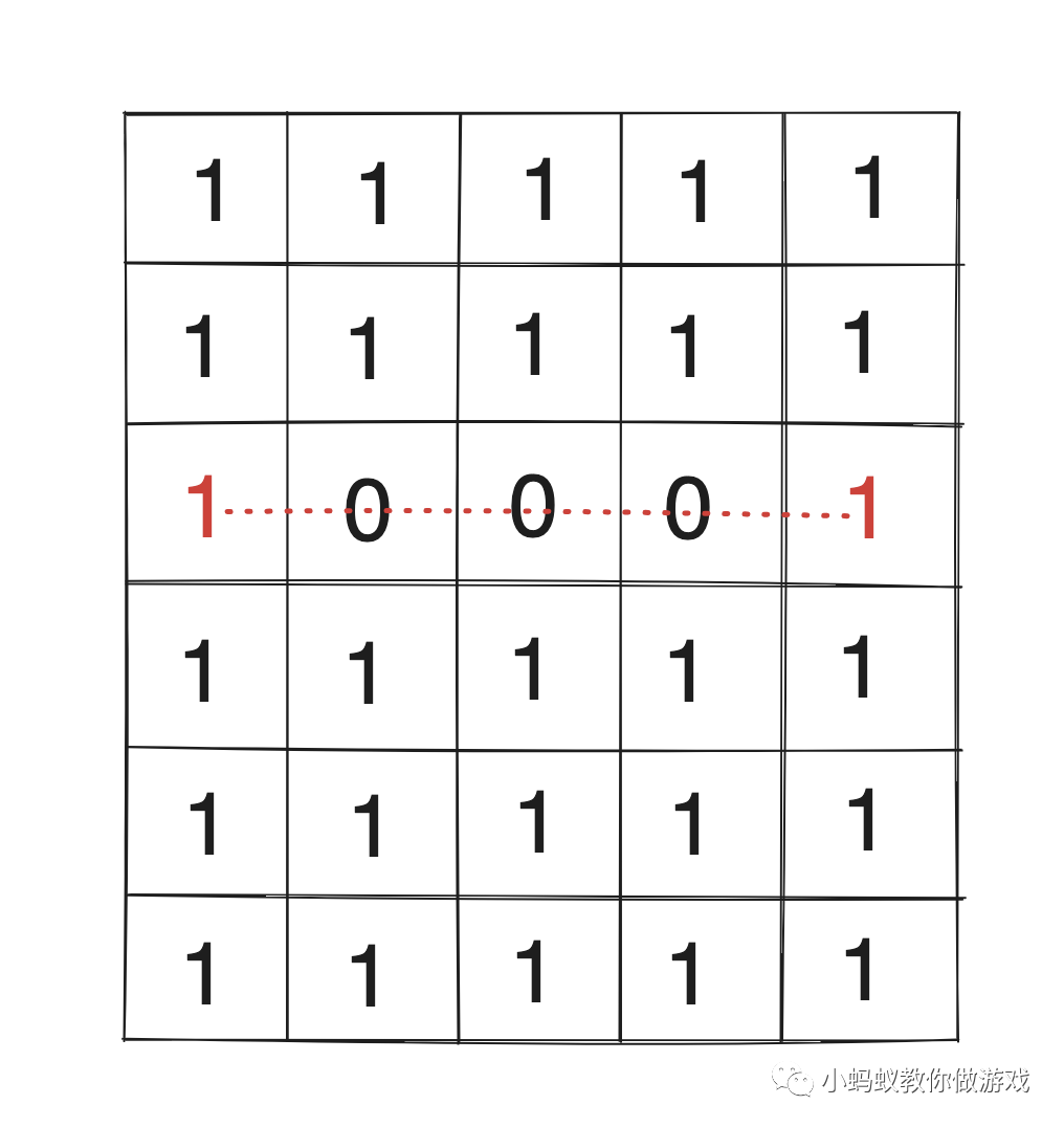 如图,要判断两个红色的 1 能否连接,只需要判断它们之间的三个位置是否为 0 即可,如果都为 0 ,则表示它们之间能够建立连接。
