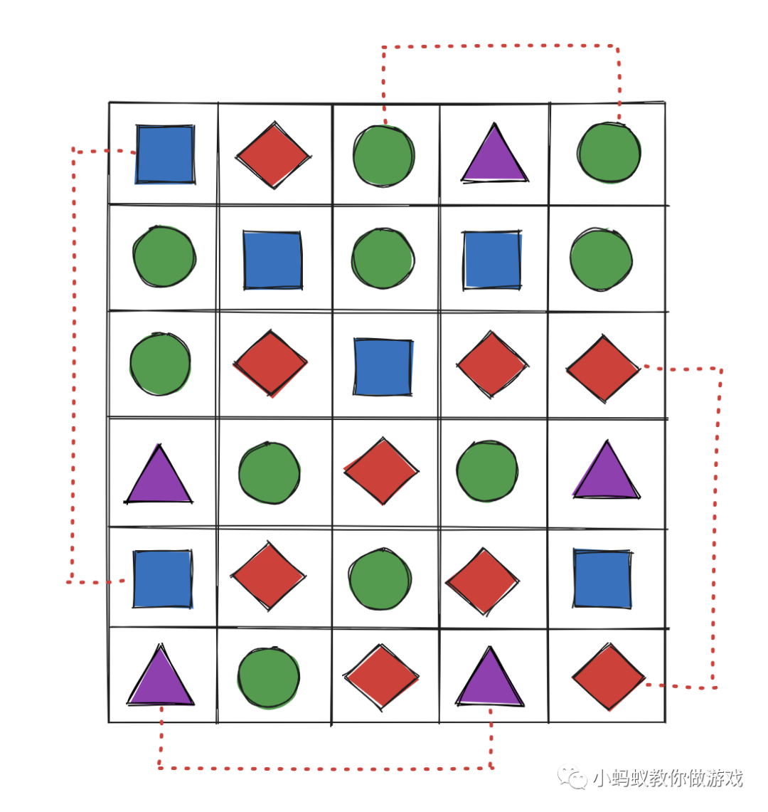 用红色虚线连起来的图标都位于边界,在游戏中这些图标都是满足连接消除条件的,对于这样的情况我们该如何判断两个图标之间是否能够连接呢?
