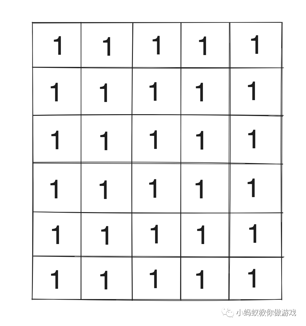 还是先从理论开始,假设现在有一个 6x5 的布局,每个位置上都有图片。根据这样的信息我们创建一个6行5列的表格,表格里的数据只有 0 和 1,0 表示这个位置没有图片,1 表示这个位置有图片。